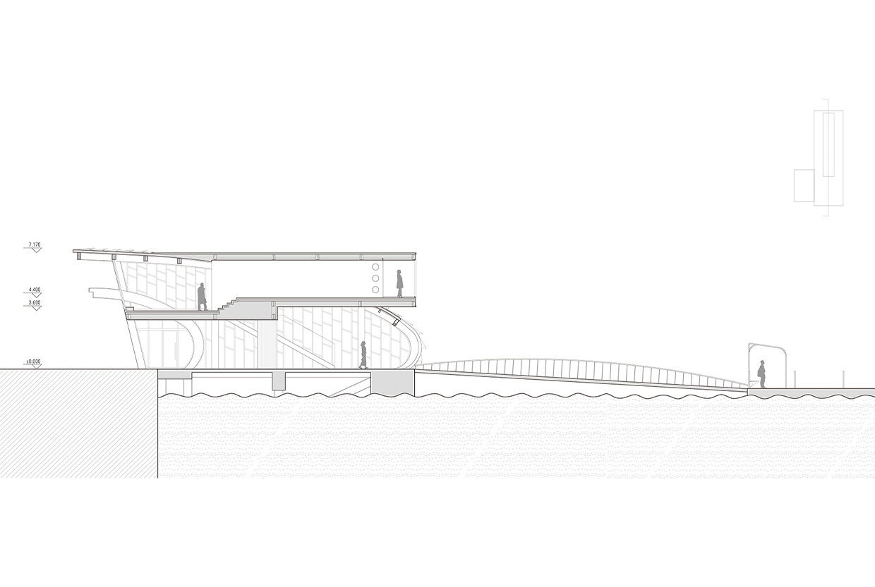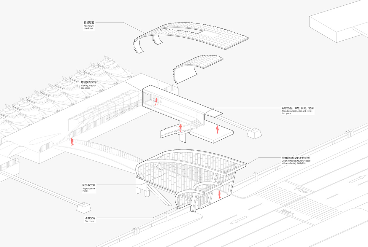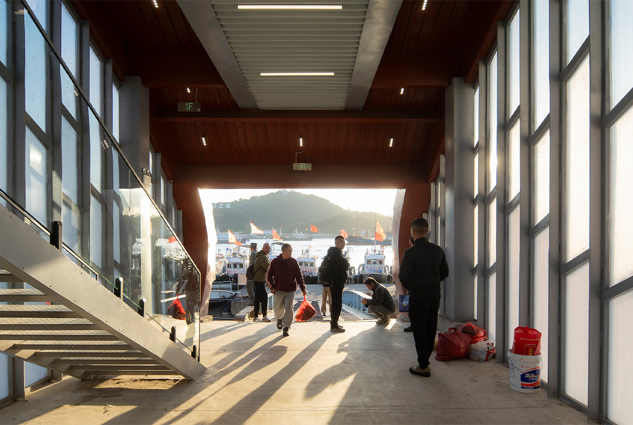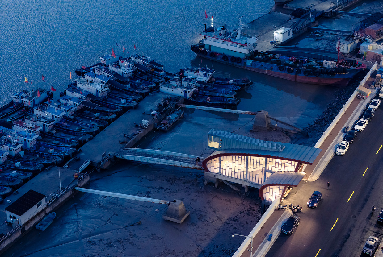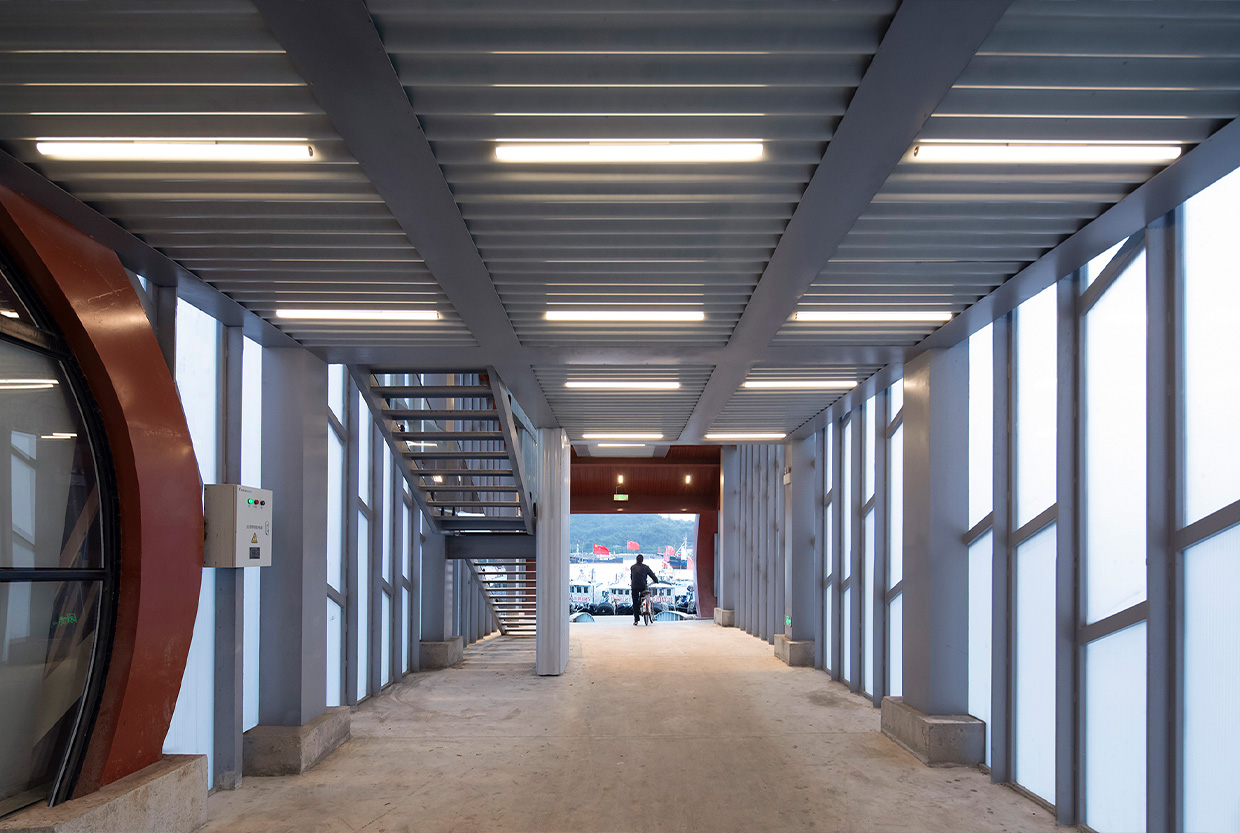 The project is located at Dongmen Pier on South Yugang Road in Shipu Town, Xiangshan County, Ningbo City, China. The renovation, in a light-touch manner, preserves the main steel structure of the original passage building. It retains the passage function while adding a second-floor visitor rest area and extending a viewing and meditation space facing the fishing port dock.