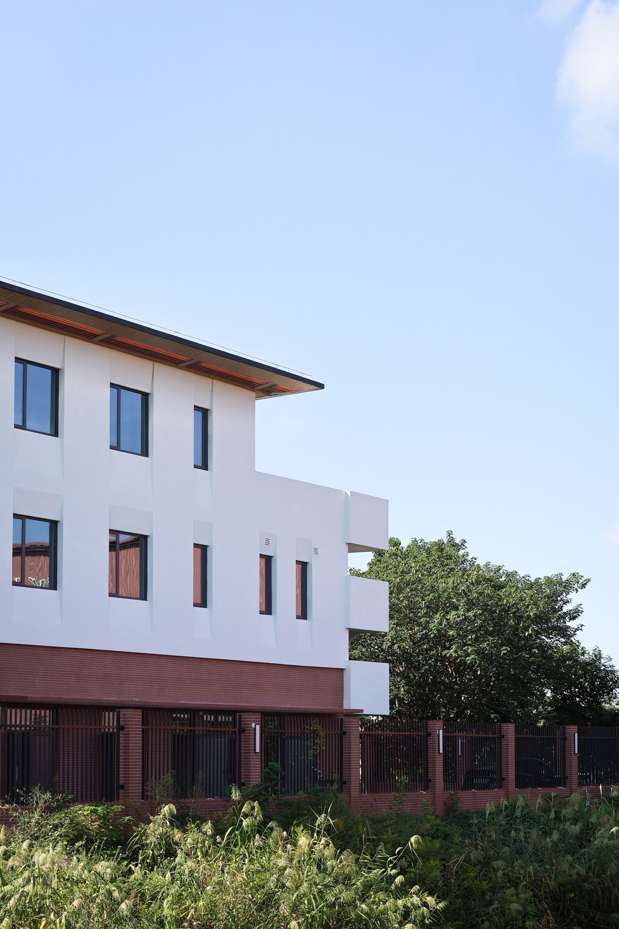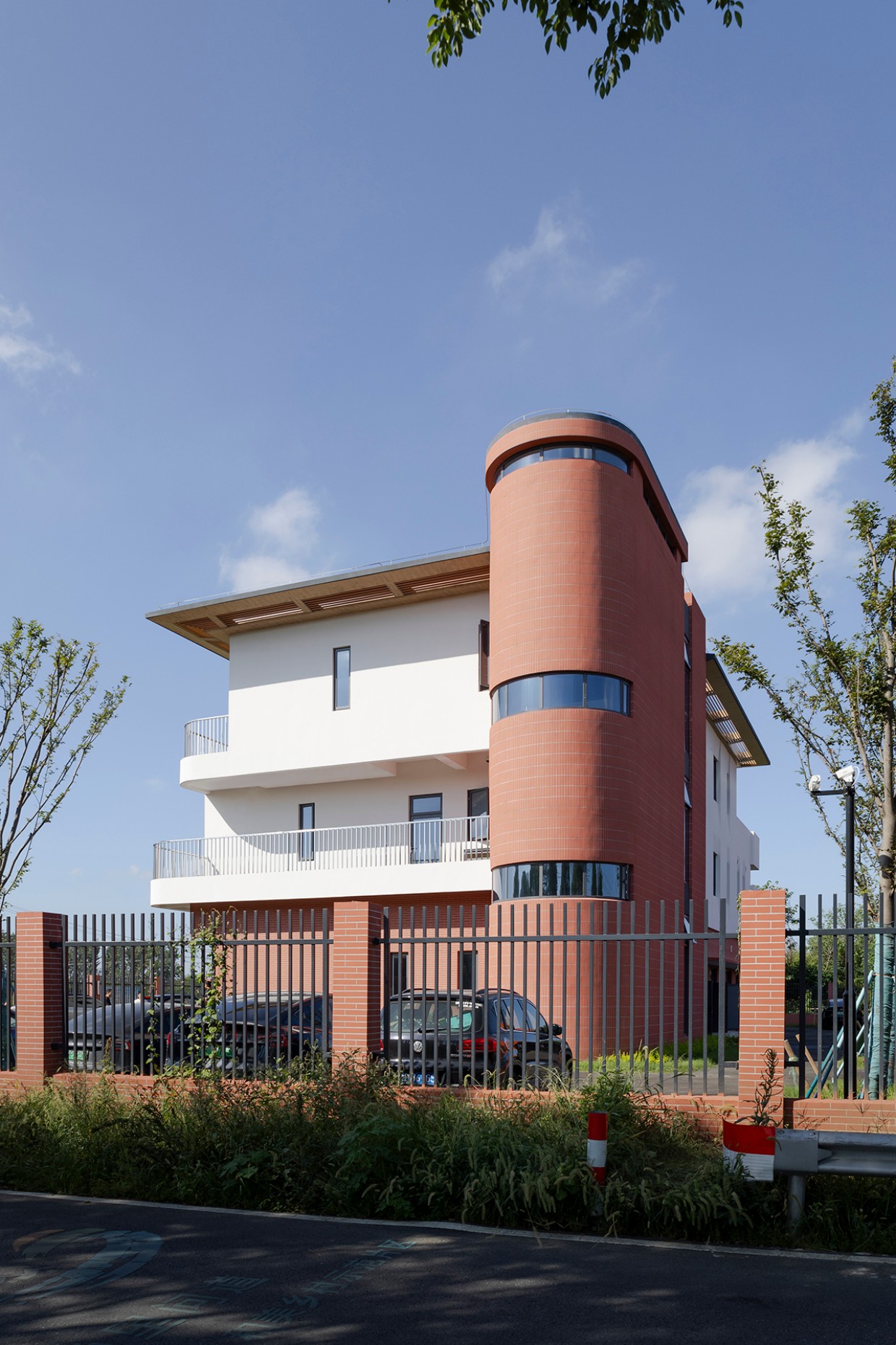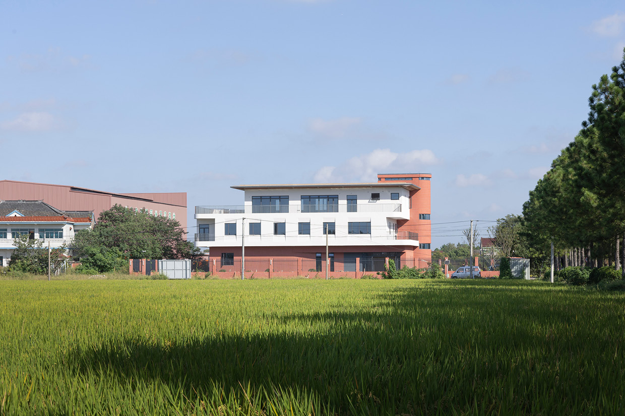 This project is an agricultural experimental building located beside paddy fields, designed to provide comprehensive functions including seed storage, soil and paddy field experiments, agricultural training, and exhibitions for researchers. Within the limited site area and floor space, the offsetting of volumes creates public spaces and terraces, enhancing flexibility and comfort in use. The third floor houses a fully equipped training conference room accompanied by a spacious terrace, ideal for observing the fields, training breaks, and outdoor teaching. The building façade combines white textured paint with red bricks, achieving a cost-effective solution while standing as a distinctive yet harmonious experimental structure in the rural setting.