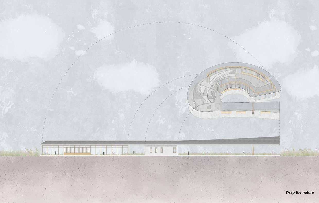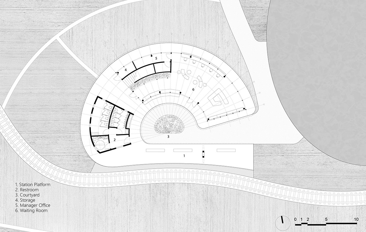 The project is a train station in the field. The semicircular volume and long waiting area create a 360° panoramic view of the building, where visitors can sit and enjoy the “static” of the countryside. At the same time, visitors can stroll around the post station and look at the landscape from the roof. The “dynamic” of the walking people and the passing train is also part of the overall landscape view, forming an extension of the building. Visitors can switch between “dynamic” and “static” to find unique ways to see the fields.