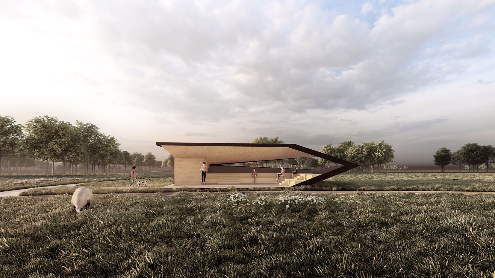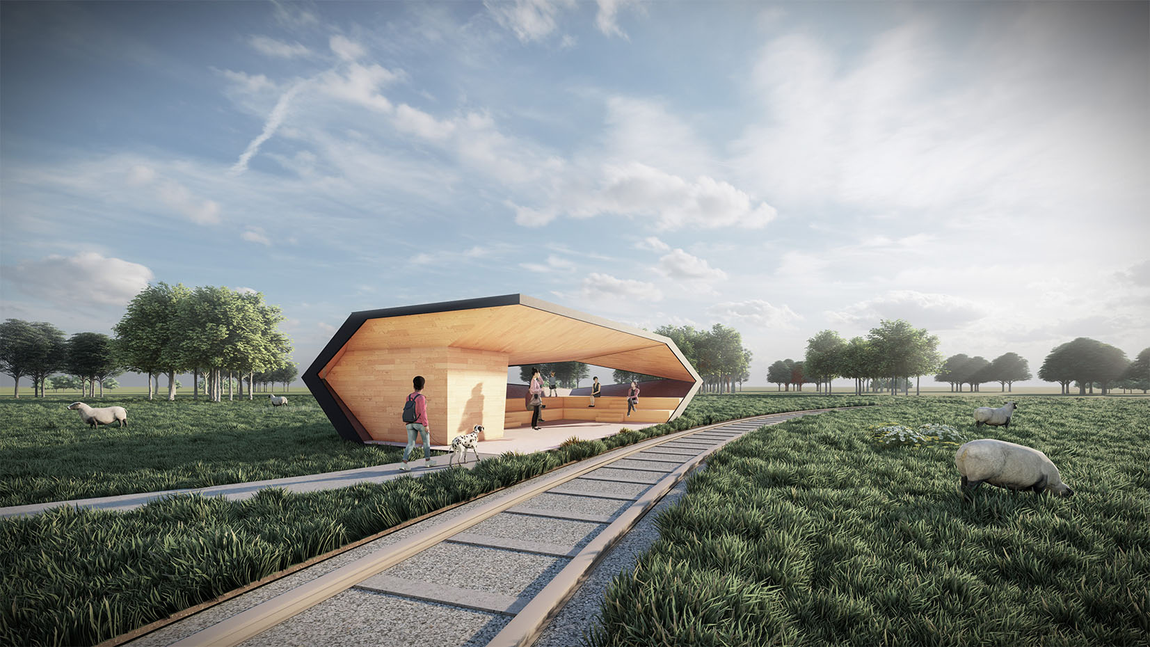 折叠驿站以折叠的盒子为概念,盒子后侧有一处折叠而出的开口,形成一处框景,将自然映入驿站内。驿站采用周边的钢梁作为结构支撑,创造无柱的等候空间。小驿站还提供了一处卫生间。游客可以坐在台阶上等候小火车并欣赏田园景色。